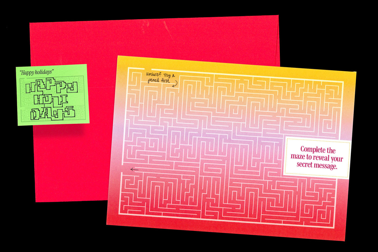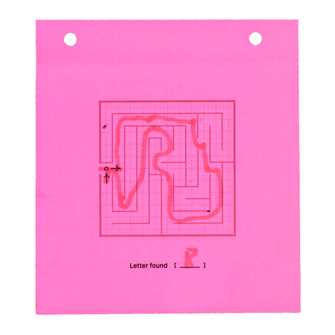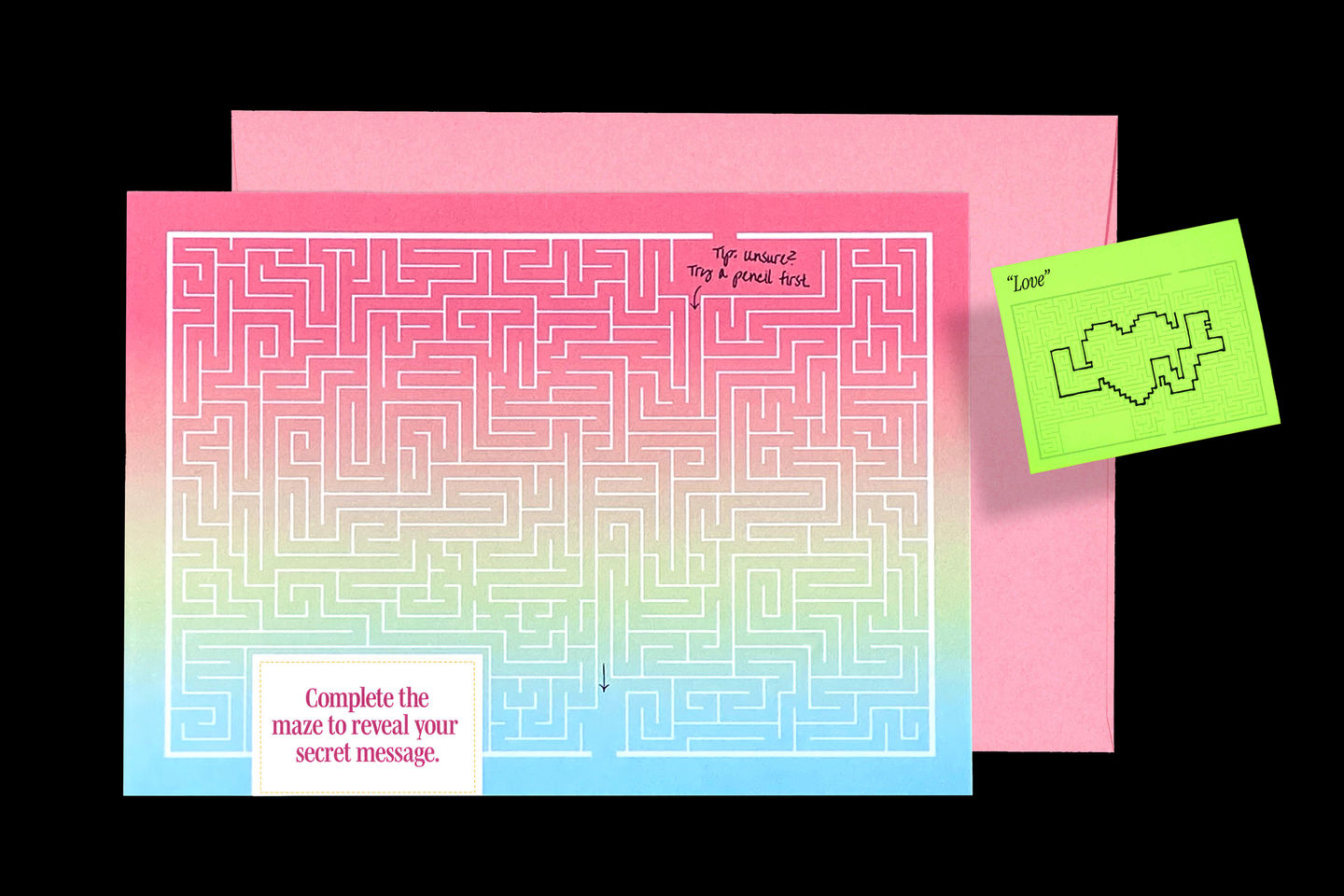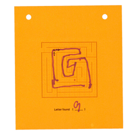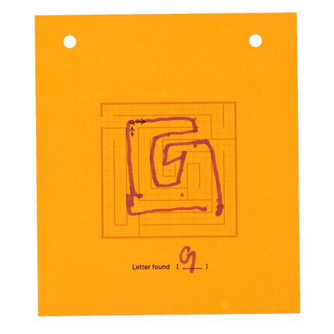 Mazzy Card applies the lettering system to small-format printed ephemera. Each card contains a single maze with one entrance and one exit; the solved path reveals a short, pre-composed word or phrase.